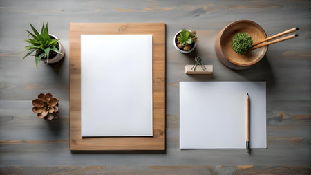 Clean and minimalist mockup featuring two blank stationery sheets on a wooden desk with natural elements. Perfect for showcasing branding. design. or typography.