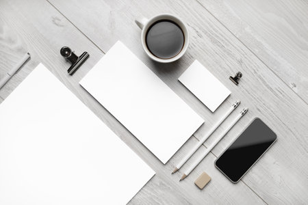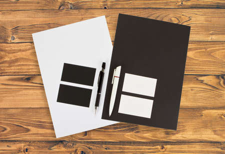 Blank stationery template on light wooden background. Mock-up for branding identity. For design presentations and portfolios.