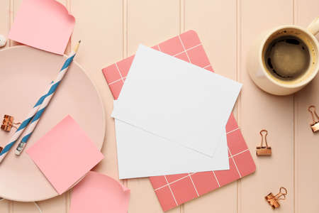 Blank cards with cup of coffee and stationery on wooden background