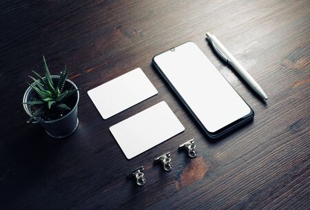 Corporate identity template on wood table background. Smartphone, business cards, pen and plant.