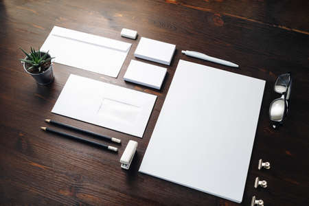 Photo of blank stationery set on wood table background. Responsive design template. Branding mock up. Blank objects for placing your design.
