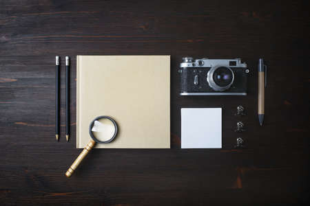 Vintage stationery set and retro photo camera on wood table background. Top view. Flat lay.