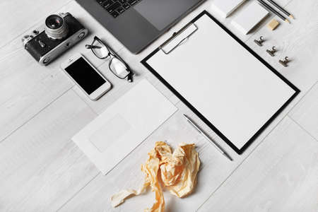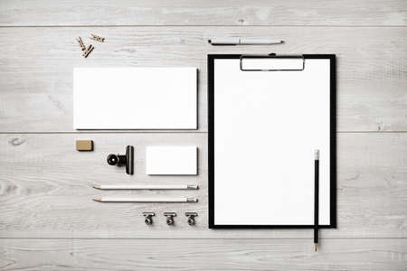 Stationery mock up. Blank corporate identity template on light wooden background. Responsive design mockup.