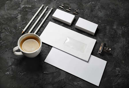 Blank stationery set on black plaster background. ID template. Mockup for branding identity for designers.