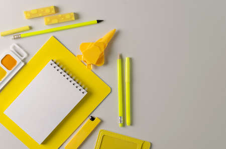 Back to school. The trend is yellow on gray. School stationery on a gray background. Pencils, erasers, notebooks, paints, sharpener plane - goods for the office yellow color.
