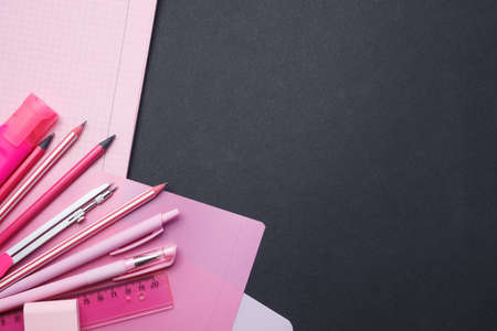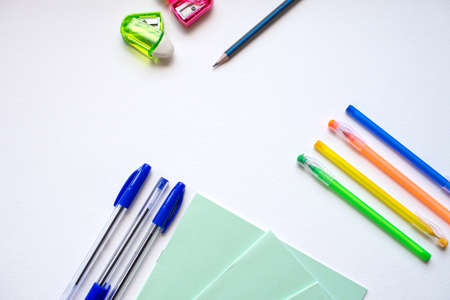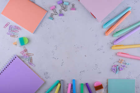 Stationery colorful writing tools accessories pens pencils, color paper. Back to school. Office supplies products. Top view. Flat lay