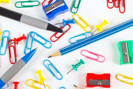 Pencil, pen, paperclips, sharpeners and thumbtacks on white desktop close up