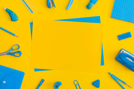 School stationery on a yellow background. Top view with copy space. Flat lay. Back to school concept.