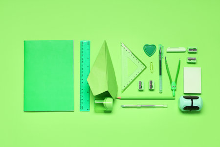 Composition with paper airplane and school stationery on green background