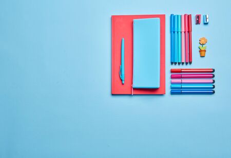 Back to school concept. School and office supplies on the office table. Blue and red background.Flat lay View from above