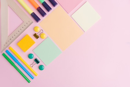 The top view of creative desk with school accessories, notebooks and colorful markers. Pastel color background with copy space for inscription. Back to school.