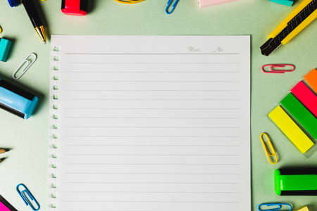 Back to school. Scattered stationery on paper background