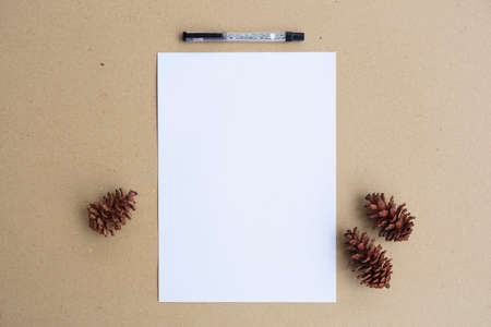 White Paper, Pine Tree Flowers and Pen On Brown Paper Background. Minimalist Style