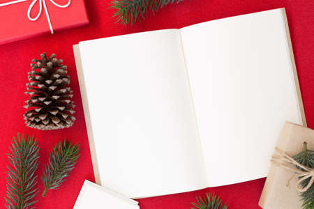 Top view of Christmas and happy new year composition, gift box, pine cones, fir branches on red background and copy space white paper for your text