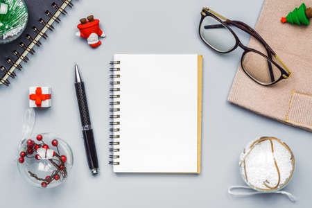 Top view of Christmas workspace with copy space and Christmas decorations with open notebook on white desk background