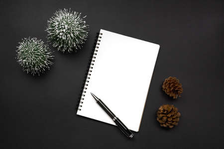 Open blank notebook, pen, pine cones and mini christmas tree in black tones. Festive Christmas and New Year concept.