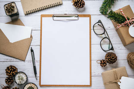 Mockup with white paper blank space notebook and Christmas decorations on table. Top view with copy space.