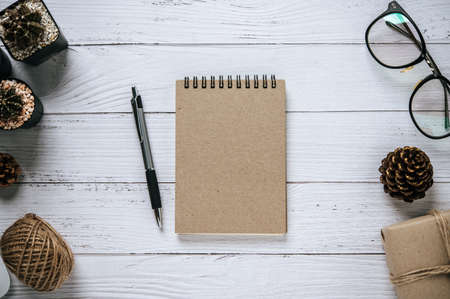 Notebooks, pens, glasses, gift boxes, ropes and cactus on a white wooden floor.