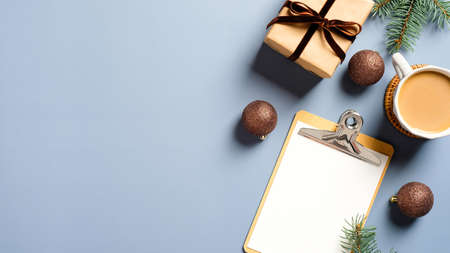 Christmas home office table, festive workspace concept. Flat lay, top view gift box, balls, pine branches on pastel blue background. Cozy, hygge, nordic style.