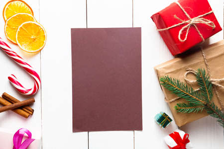 Beautiful Christmas composition on wooden white background.Empty card with Christmas present boxes, snowy fir branches, conifer cones, dried fruits, caramel stick, gift. New Year.Top view, copy space.