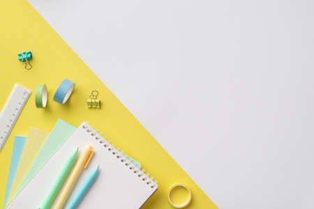 Back to school concept. Top view photo of school supplies copybooks pens ruler adhesive tape and binder clips on bicolor yellow and white background with copyspace
