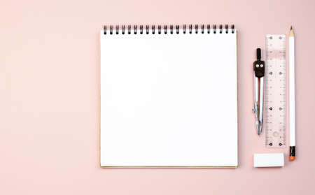 Square notebook on a spring for writing and drawing on a pink background, compasses, ruler, pencil, eraser. Pink background with copy space. Background for work and school. Flat lay. Back to school. S