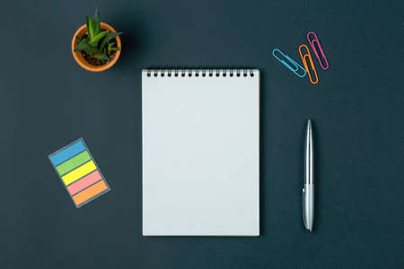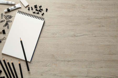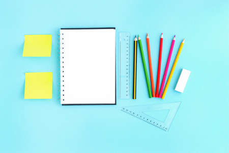 Blank open notebook with blank sheets and around stationery and colour pencils ruler. Space for text, office work during quarantine and virus