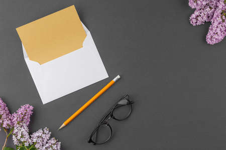 Overhead shot of mock-up greeting card with grey envelope on dark office desk with digital devices and office supplies