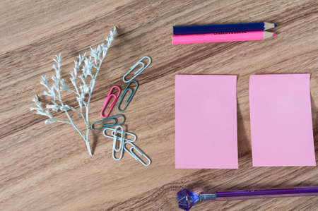 Mock up background with business cards and pencils on a pink paper backdrop