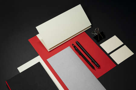 Stationery branding mockup template with red A4 Letterhead, business card, envelope, note bookpencil. dark background real photography