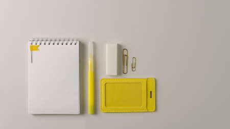 White notebook and stationery yellow on a gray background. Copying space, flat layout