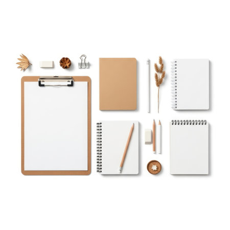 The image displays a neatly arranged collection of office supplies on a white background. It includes a clipboard, several notebooks, pencils, a pencil sharpener, a small dish, a binder clip, and some dried flowers. The items are organized in a minimalist and aesthetically pleasing manner, emphasizing productivity and creativity.