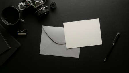 Overhead shot of mock-up greeting card with grey envelope on dark office desk with digital camera and office supplies