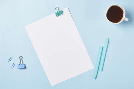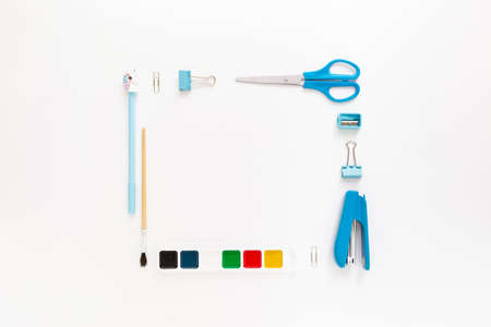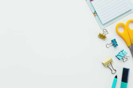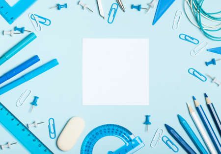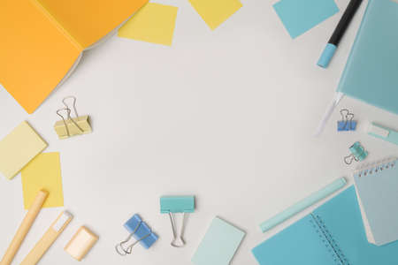 Top view of modern white blue office desktop with school supplies and stationery on table around empty space for text. Back to school concept flat lay with mockup