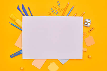 Sheets of paper with school stationery on yellow background. Monochrome photography. Flat lay. Creative layout