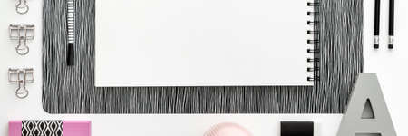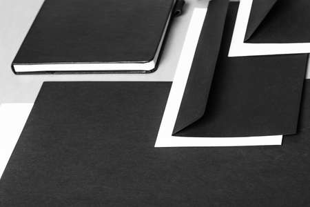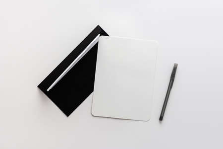 Black and white stationery set free space flat lay. Top view on white desk with office supplies, mockup. Business, worktools, education, accessories concept