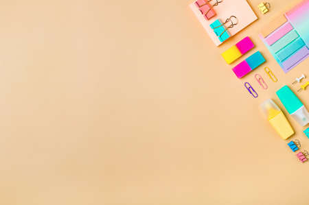 Neutral pastel beige background and school supplies, stationery accessories in top-right edge. Copy space. Top view flat lay. Education, back to school, freelancer work concept.