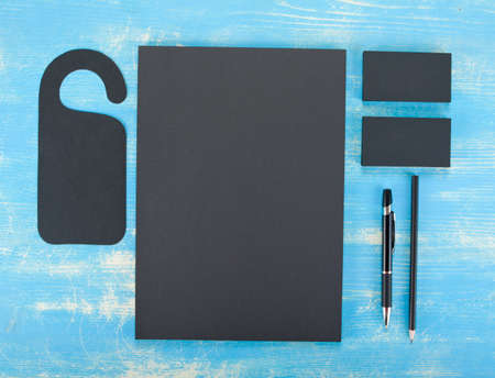 Corporate branding mockup template, isolated on dark wooden background.