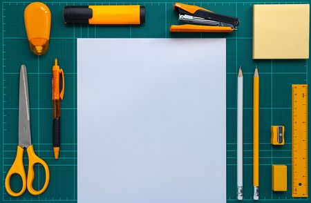 Flat lay picture of orange stationery and white paper on green cutting mat