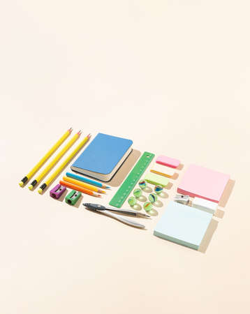 Creative neatly arranged school supplies with sunlit shadows on bright beige background. Minimal workspace concept.