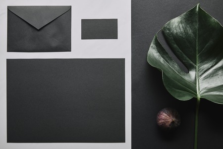 Business mock up with black envelope and card on white marble background