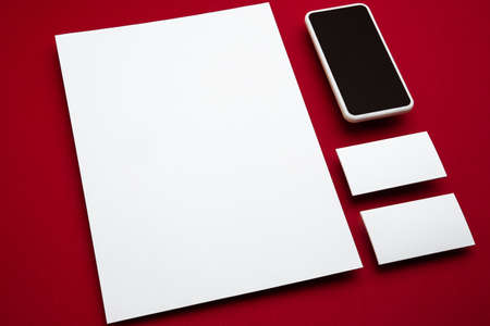 Smartphone and blank flyer posters and cards floating above red background. Office styled, modern mockup for advertising, image or text. Blank white copyspace for design, business and finance concept.