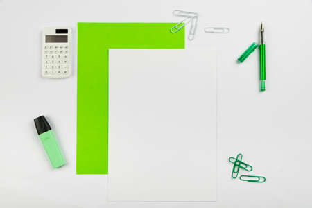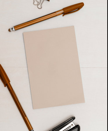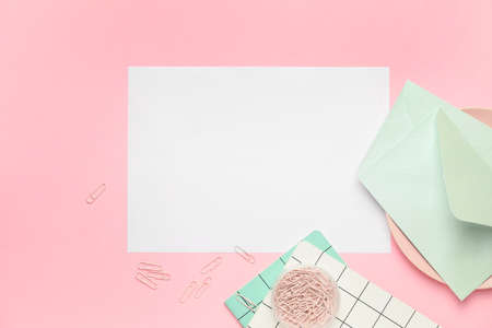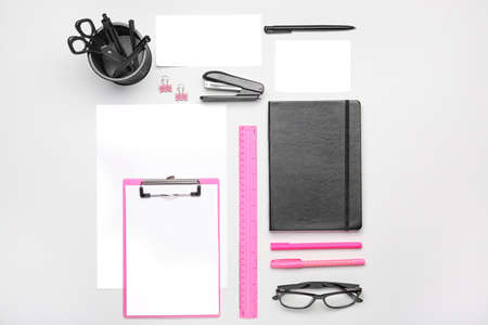 Composition with blank paper sheet and stationary on white background