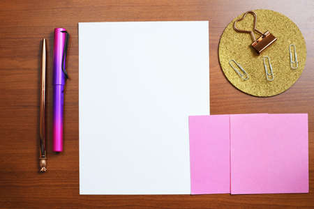 Top view of wooden office desk with blank notepad, stationery and other items. Mock up