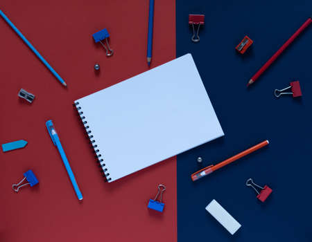 Back to school concept. School and office supplies on the office table. Blue and red background.Flat lay View from above