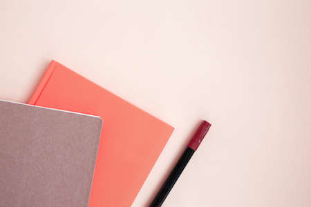 Orange and brown notebooks and brown marker on light background. Stationery on a beige background with space for text. Back to school, creative workplace. Flat lay
