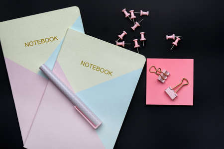 notebook with a metal pen on a black background, office concept