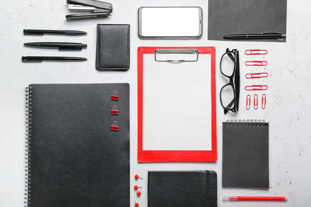 Composition with clipboard, mobile phone and stationary on light background