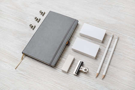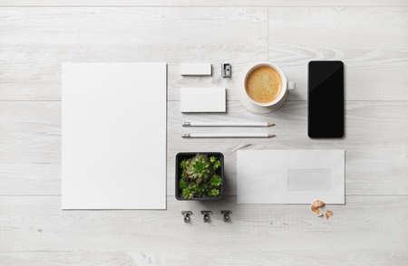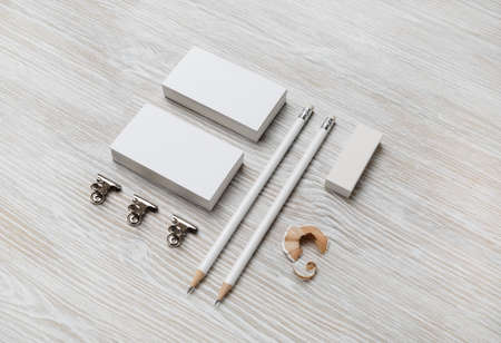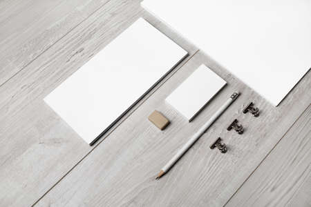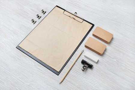 Blank stationery template on light wooden background. Mock-up for branding identity. For design presentations and portfolios.
