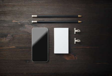 Smartphone, business card and pencils. Blank stationery set on wooden background. ID template. Mockup for branding identity for designers. Top view. Flat lay.